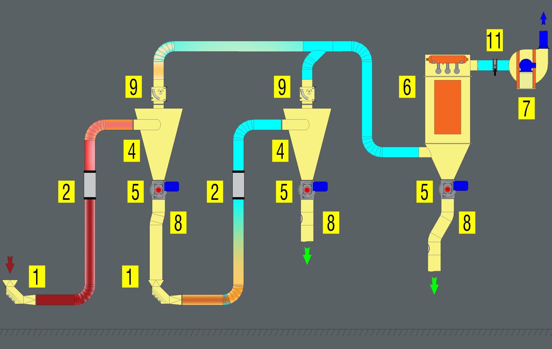 Construimos líneas de enfriado y secado verticales o por transporte neumático, incluyendo los ciclones, filtros de mangas, ventiladores, controles y automatizaciones.