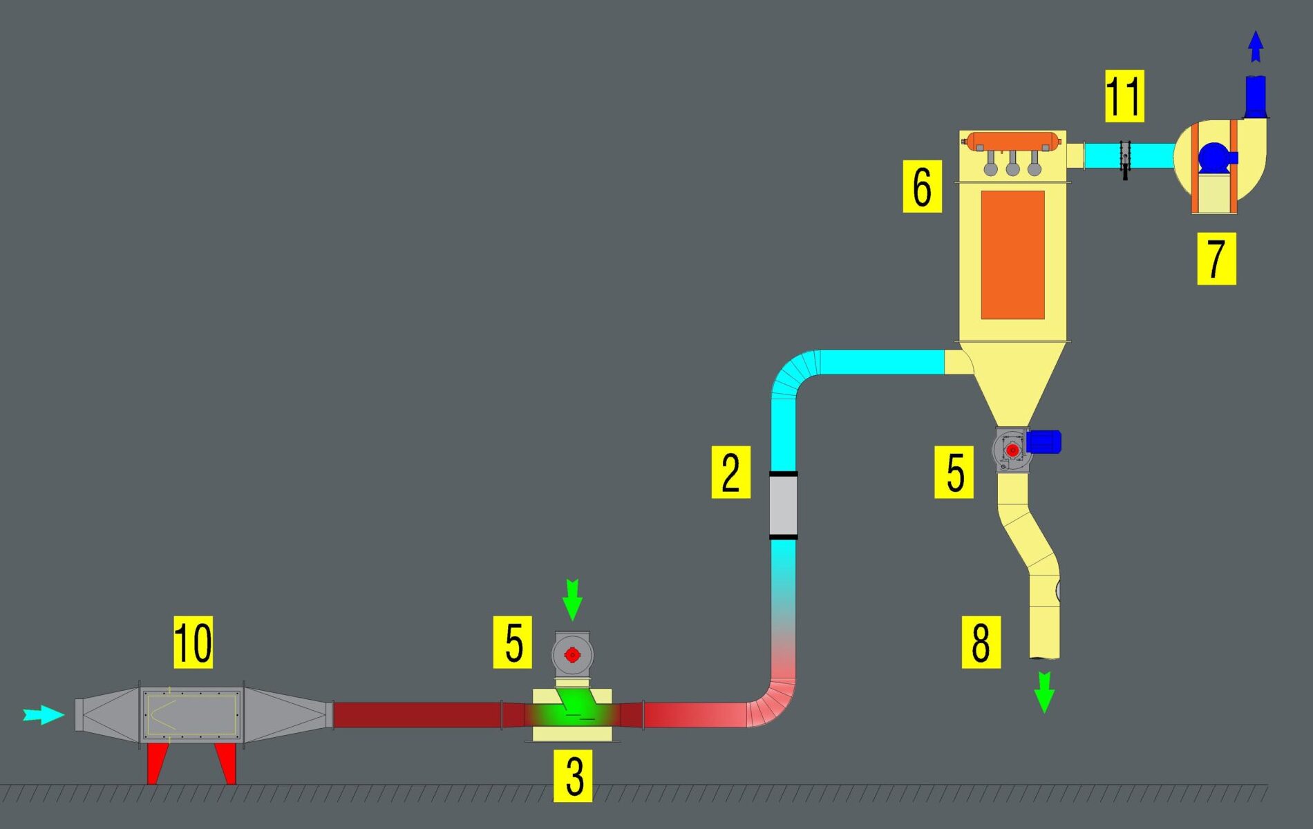 A diferencia de nuestras máquinas de secado y enfriado a contraflujo, en los sistemas de transporte neumático el flujo del aire y del producto circulan en la misma dirección, produciendo un contacto menos eficiente calóricamente pero altamente uniforme.